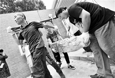 在昨天的文物搬運(yùn)現(xiàn)場,兩位工人挑擔(dān)子,兩位工人用手托住龍頭兩邊,四人費(fèi)了好大勁才將螭頭搬到車上,開啟“回家”之路。待螭頭到達(dá)圓明園后,將有專家對它們進(jìn)行全身“體檢”,制定修復(fù)方案?!斑@些螭頭有一些小裂縫,如果不好好保護(hù),時間久了容易出問題?!眻A明園文物考古科科長陳輝說。(記者 李夢婷)