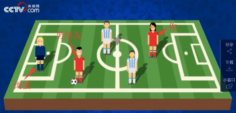 男:舉個例子,比如你和你的男朋友是一隊(duì),你的閨蜜是對方的守門員。當(dāng)你傳球給你男朋友時,你男朋友比任何時候都更加靠近你閨蜜。此時,你的男朋友就越位啦。