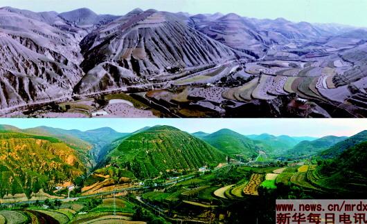 在衛(wèi)星遙感圖上清晰可見(jiàn)一條綠色的分界線,與行政邊界相吻合,標(biāo)志著“綠色延安”已經(jīng)形成