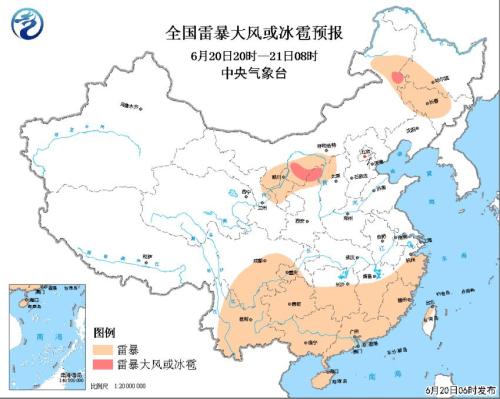 預(yù)計(jì)6月20日08時(shí)到21日08時(shí),貴州、湖南中南部、江西、浙江、福建、廣東中北部、海南東北部、云南西南部等地的部分地區(qū)將有短時(shí)強(qiáng)降水天氣,小時(shí)雨強(qiáng)20-50毫米,局地可達(dá)60毫米以上;另外,內(nèi)蒙古中部和東部、吉林南部、遼寧東北部、浙江南部、福建北部和南部、廣東北部等地局地將有雷暴大風(fēng)或冰雹天氣。