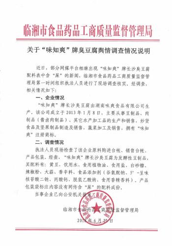 情況說明指出,近日,部分網(wǎng)媒平臺相繼出現(xiàn)“味知爽”牌長沙臭豆腐配料表中含“屎”的新聞,臨湘市食品藥品工商質(zhì)量監(jiān)督管理局第一時間組織執(zhí)法人員進(jìn)行了現(xiàn)場調(diào)查核實。
