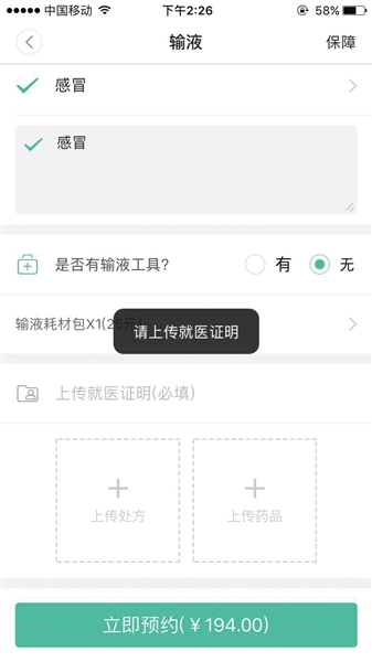 某“共享護(hù)士”平臺要求預(yù)約時提供就醫(yī)證明,但記者提供虛假資料也能通過審核。 手機截圖