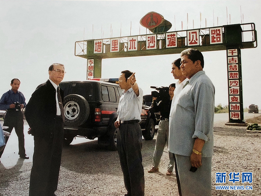 1999年,趙南起同志率全國(guó)政協(xié)防治荒漠化調(diào)研組在新疆塔里木沙漠公路調(diào)研。新華社發(fā)