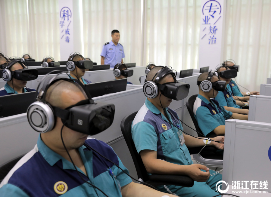 6月26日,浙江拱宸強(qiáng)制隔離戒毒所內(nèi),戒毒人員通過腦電技術(shù)和VR技術(shù)輔助戒毒。這些黑科技可以讓戒毒人員身臨其境地體會(huì)到吸毒的危害,從心理上減弱對毒品的依賴。(浙江在線記者 錢璐斌 徐文迪 攝)