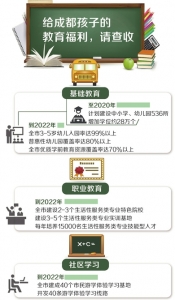在增加教育公共服務供給方面,成都市全面實施中心城區(qū)中小學、幼兒園“三年攻堅”行動計劃,至2020年計劃建設中小學、幼兒園536所,增加學位約28萬個,滿足市民公共教育服務需求。進一步擴大學前教育資源總量,鼓勵扶持普惠性幼兒園。到2022年,全市3-5歲幼兒入園率達99%以上,普惠性幼兒園覆蓋率(公辦幼兒園和普惠性民辦幼兒園在園幼兒數(shù)占在園幼兒總數(shù)的比例)達80%以上,全市優(yōu)質學前教育資源覆蓋率(二級園以上在園幼兒數(shù)占在園幼兒總數(shù)的比例)達70%以上。