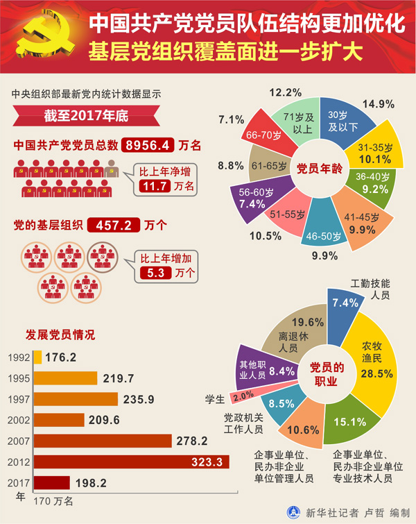 截至2017年12月31日,中國共產(chǎn)黨黨員總數(shù)為8956.4萬名,比上年凈增11.7萬名,增幅為0.1%。