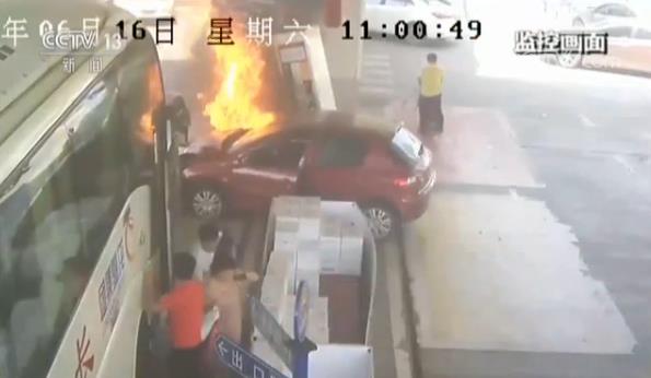 監(jiān)控畫(huà)面顯示,6月16日上午11點(diǎn)左右,中石油長(zhǎng)沙市岳麓大道加油站內(nèi),一輛紅色轎車(chē)突然失控撞倒加油機(jī),隨即引發(fā)大火。