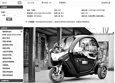 如淘寶上一家電動(dòng)車(chē)銷(xiāo)售商家就直言標(biāo)注:“此車(chē)不能辦理牌照,也不需要駕照,請(qǐng)根據(jù)當(dāng)?shù)貙?shí)際政策購(gòu)車(chē),不能因上牌問(wèn)題退貨?!?/p>