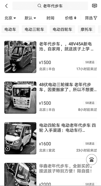 北青報(bào)記者在“閑魚(yú)”“轉(zhuǎn)轉(zhuǎn)”等二手貨交易平臺(tái)上鍵入“老年代步車(chē)”后,可以搜索上百條等待交易的信息,有大興、豐臺(tái)、順義、東城、朝陽(yáng)等地車(chē)主發(fā)布的交易信息,“北京車(chē)主看車(chē)方便”,多為當(dāng)面交易。