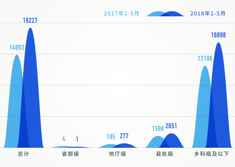 在給予黨政紀(jì)處分人數(shù)中,除省部級(jí)干部人數(shù)降低了以外,地廳級(jí)、縣處級(jí)、鄉(xiāng)科級(jí)及以下人數(shù)相比同期均大幅提升。特別是,今年1-5月,給予鄉(xiāng)科級(jí)及以下人員黨紀(jì)政務(wù)處分達(dá)16898人,相比同期增長(zhǎng)28.9%,且占到了處分總?cè)藬?shù)的87.9%。反映出全面從嚴(yán)治黨不斷向基層延伸,持續(xù)加大查處群眾身邊的“四風(fēng)”和腐敗問(wèn)題力度。