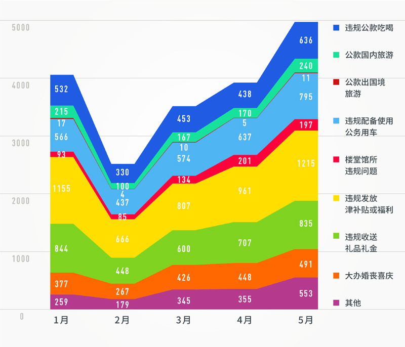 1-5月各個(gè)類型查處問(wèn)題數(shù)堆積面積圖