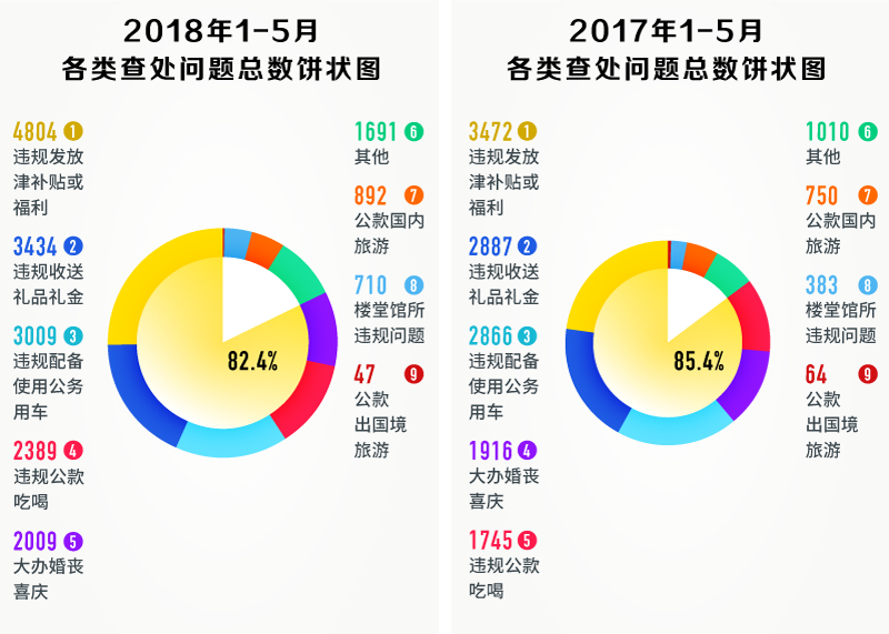 2017年、2018年1-5月各類查處問(wèn)題總數(shù)餅狀圖,違規(guī)發(fā)放津補(bǔ)貼或福利、違規(guī)收送禮品禮金、違規(guī)配備使用公務(wù)用車、違規(guī)公款吃喝、大辦婚喪喜慶等“老問(wèn)題”占比較大,均超80%
