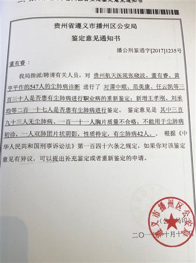 張曉波的妻子董捷告訴記者,辦案機關(guān)認定三位醫(yī)生“失職罪”的主要依據(jù)是一份鑒定通知書。2017年10月12日,貴州省遵義市播州區(qū)公安局下達鑒定意見通知書,稱指派有關(guān)人員對張曉波、董有睿、黃亨平做的547人的塵肺病診斷進行了重新鑒定。鑒定意見為其中393人無塵肺病、111人胸片質(zhì)量不合格,不能用于塵肺病初診;一人性質(zhì)待定;有塵肺病42人。