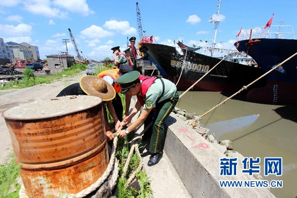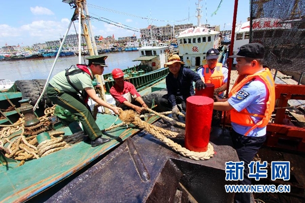7月10日,在浙江省臺州市路橋區(qū)金清港,公安民警與邊防官兵聯(lián)合巡邏,幫助漁民做好漁船防風(fēng)加固。新華社發(fā)(蔣友親 攝)