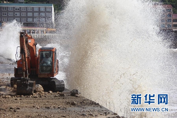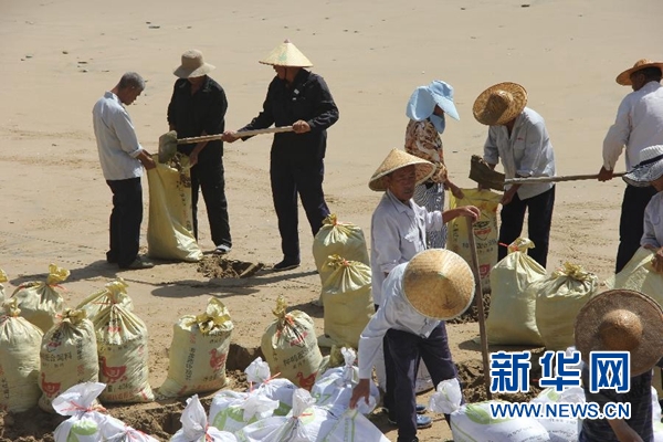 7月10日,在浙江省溫嶺市石塘鎮(zhèn)金沙灘,景區(qū)工作人員在進(jìn)行加固堤壩作業(yè)。新華社發(fā)(金云國 攝)