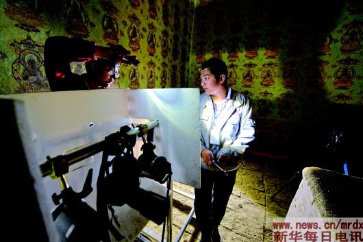 ▲工作人員對(duì)莫高窟第152窟進(jìn)行數(shù)字化采集。 攝影:本報(bào)記者陳斌