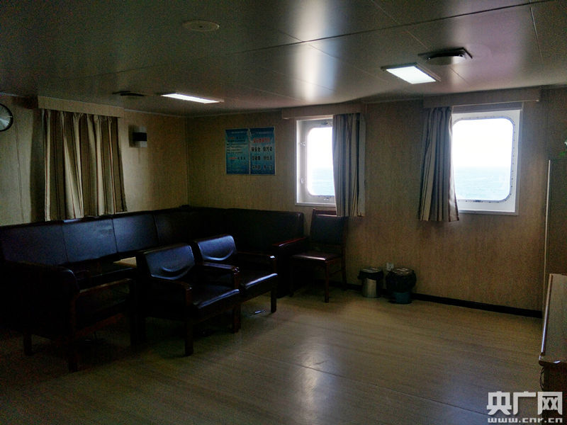 餐廳對面是船員休息區(qū),裝有衛(wèi)星電視。以前出海就相當(dāng)于與外界隔絕。而現(xiàn)在,打開船上的電視,每天都能看到十幾個頻道的電視節(jié)目。茫茫大海上,雖遠(yuǎn)離陸地,卻時時刻刻都可以看到國內(nèi)最新動態(tài),信息無盲區(qū)。