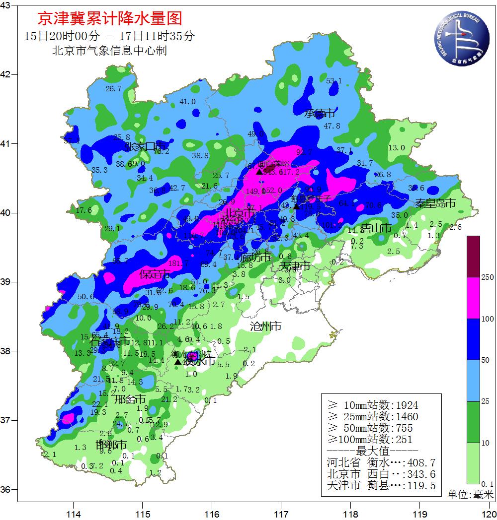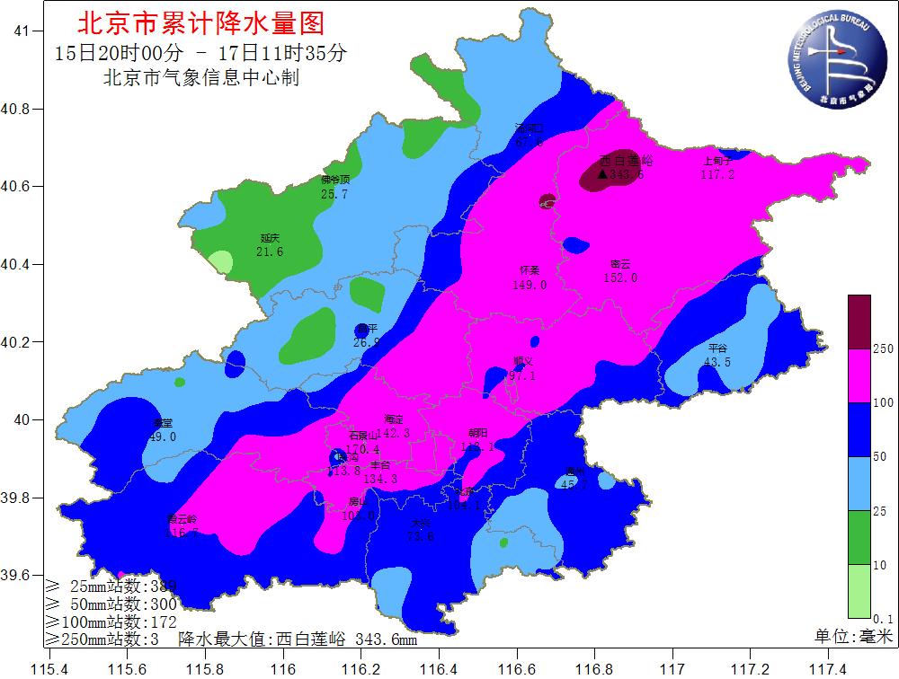 根據(jù)氣象觀測(cè),15日20時(shí)至17日8時(shí),北京市平均降水量達(dá)77.7毫米,城區(qū)平均100.9毫米,全市453個(gè)氣象觀測(cè)站中有121個(gè)超過100毫米、12個(gè)超過200毫米。其中,密云有2個(gè)測(cè)站超過300毫米,分別是西白蓮峪達(dá)(336毫米)和捧河巖村(302毫米)。