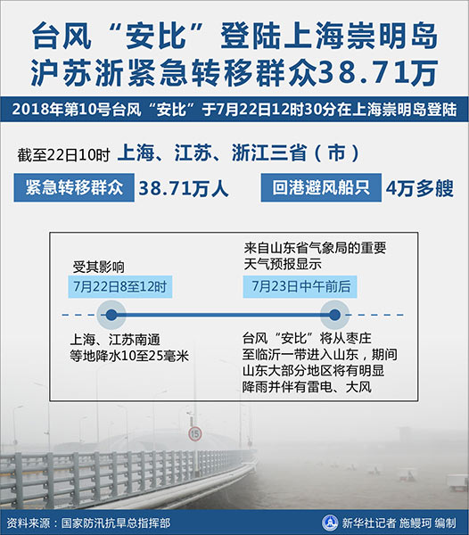 22日早上8點(diǎn),今年第10號(hào)臺(tái)風(fēng)“安比”的中心位于上海東南方約160公里,過(guò)去3小時(shí)“安比”向西北方向移動(dòng)約70公里,預(yù)計(jì)將于22日中午前后在上海到江蘇啟東一帶沿海登陸。2018-07-22 12:09:53