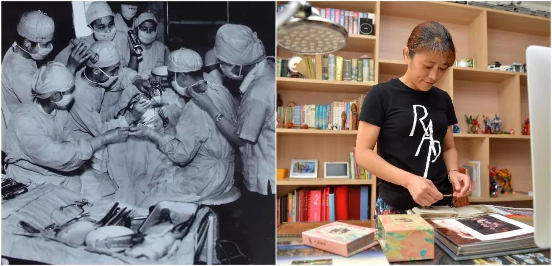 拼版照片:左圖為唐山大地震發(fā)生后,上海醫(yī)療隊在給傷員做手術(資料照片);右圖為2016年7月24日,“地震嬰兒”孫滬在家中整理老照片(新華社記者 牟宇 攝)。