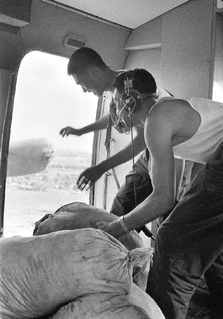 人民解放軍把祖國各地人民支援災區(qū)的抗震救災物資,空投給災區(qū)人民群眾。(1976年8月1日發(fā))新華社記者 韓曉華 攝
