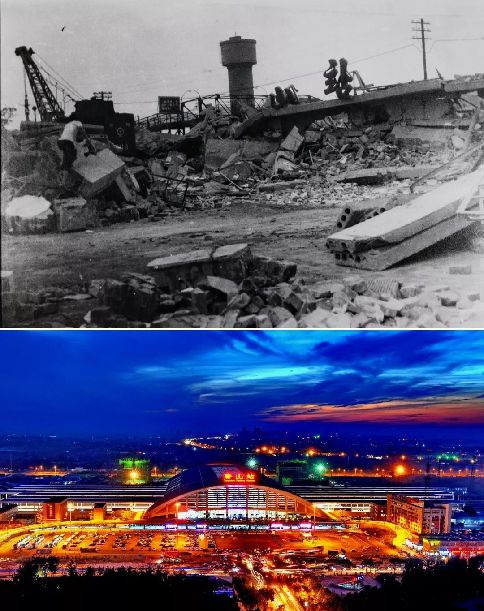 拼版照片:上圖為唐山市震后照片(資料照片)。下圖為2016年5月17日拍攝的唐山市夜景(新華社記者 楊世堯 攝)。