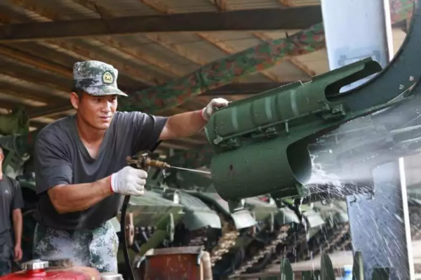 按照規(guī)定,訓(xùn)練完畢后,需對(duì)戰(zhàn)車進(jìn)行清理保養(yǎng),小編也想上去幫幫忙,手接觸到坦克鋼鐵蓋時(shí),一下子被燙的縮了回來。