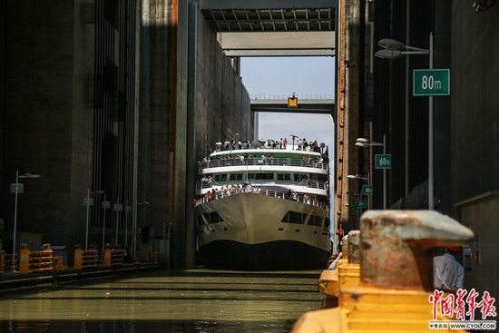 7月31日,湖北省宜昌市,船只準(zhǔn)備進(jìn)入三峽大壩升船機(jī),進(jìn)入廂體后這艘100多米長的客船將乘升船機(jī)下降80多米,“翻越”大壩。三峽升船機(jī)是世界上規(guī)模最大的升船機(jī),也是三峽工程的收官之作。中國青年報(bào)·中青在線記者 趙迪/攝