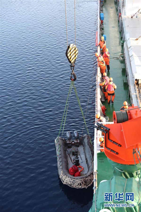 回收浮球的橡皮艇準備就位。長長的懸梯從“雪龍”號上放下,5名考察隊員依次下到橡皮艇上,頂著凜冽海風直奔浮球處?!皳魄颉惫ぷ鬟M展得十分順利,不久,橡皮艇就拖著鮮艷的浮球由遠及近駛向“雪龍”號的后甲板作業(yè)區(qū)。潛標被成功收回,相關考察隊員隨即對潛標開展維護和數(shù)據(jù)采集工作。