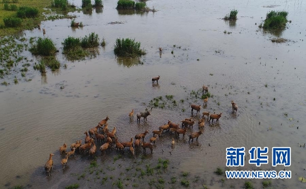一群自然野化的麋鹿在湖南東洞庭國(guó)家級(jí)自然保護(hù)區(qū)內(nèi)活動(dòng)(2017年5月10日無(wú)人機(jī)拍攝)。 新華社記者 李尕 攝