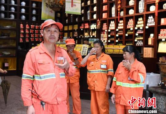 在位于河坊街的方回春堂國藥館內(nèi),曲徑通幽處,不少橙色的身影正坐在回廊上休息。這些附近的環(huán)衛(wèi)工人大多會(huì)在午后來方回春堂休憩片刻,喝上一杯“六月神仙茶”。