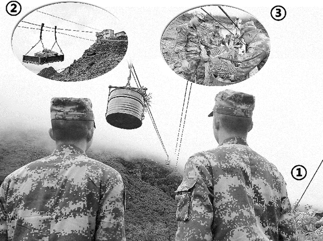 在索道運輸平臺上,連隊官兵將副食、報紙書籍等物資,裝入幾個特制鐵箱中。在他們身旁,一根杯口粗的鋼索直入云霄……
