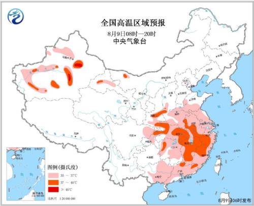據(jù)中央氣象臺網(wǎng)站消息,中央氣象臺8月9日06時繼續(xù)發(fā)布高溫黃色預(yù)警:預(yù)計8月9日白天,陜西中南部、黃淮大部、江淮、江漢、四川盆地東北部、江南大部、華南中東部、甘肅西部及新疆南疆盆地和沿天山一帶等地的最高氣溫有35~36℃。
