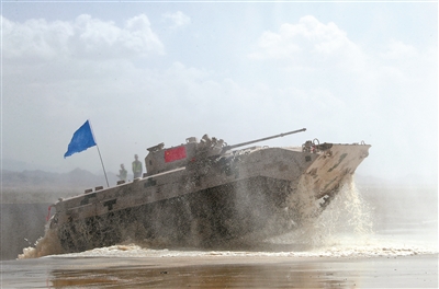 “蘇沃洛夫突擊”步戰(zhàn)車組項目比賽中,中國參賽隊?wèi)?zhàn)車穿越涉水場。袁 凱攝