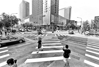 8月17日,石景山區(qū)的魯谷西街與政達(dá)路交叉處的十字路口有了新樣貌。與傳統(tǒng)的十字路口不同,除了四條常規(guī)的人行道之外,路口處多出了兩條交叉對(duì)角線作為人行斑馬線。