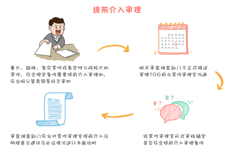 以提前介入審理為例,該規(guī)范明確,對于重大、疑難、復(fù)雜案件或者對違紀(jì)行為性質(zhì)認(rèn)定分歧較大的案件,符合規(guī)定條件需要提前介入審理的,相關(guān)審查調(diào)查部門應(yīng)當(dāng)在報分管委領(lǐng)導(dǎo)同志審批后,于正式移送審理10日前與案件審理室溝通,經(jīng)案件審理室形式審核確定是否符合提前介入審理?xiàng)l件。審查調(diào)查部門應(yīng)當(dāng)對案件審理室提前介入后所提意見建議及補(bǔ)證情況進(jìn)行書面說明。