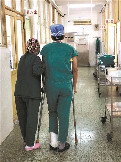 泗陽縣中醫(yī)院泌尿外科醫(yī)生劉玉忠為擇期手術(shù)病人拄拐上陣,堅持手術(shù)。
