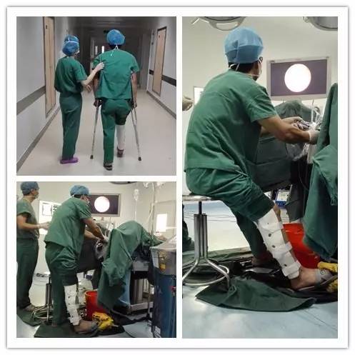 暨南大學附屬順德醫(yī)院(原“順德區(qū)第二人民醫(yī)院”)耳鼻咽喉頭頸外科副主任李郁明醫(yī)生左腳打著石膏、拄著拐杖還堅持為患者做手術(shù)。