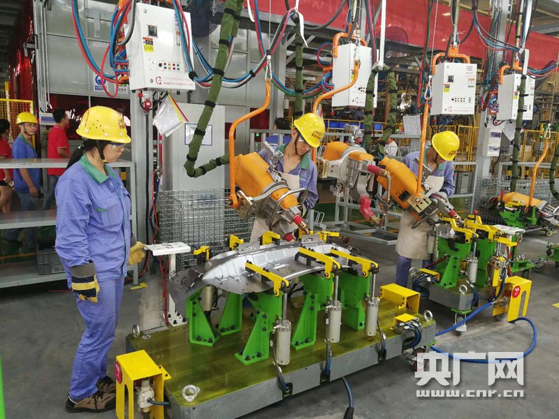 記者來(lái)到總裝車間內(nèi),焊裝機(jī)器正不間斷的工作著。
