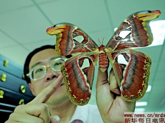 有人害怕蝴蝶和蛾子,以為它們翅膀表面的鱗片有毒。趙力解釋說,其實那些鱗片和頭發(fā)的成分一樣,人接觸了以后并不會有不良反應。