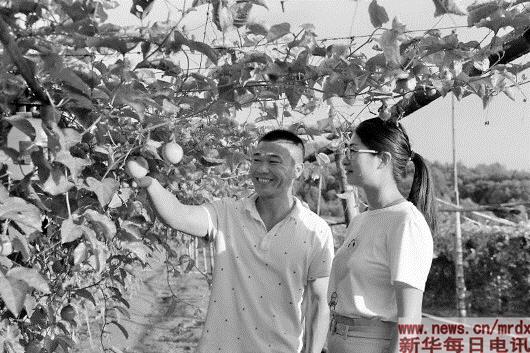 武平縣返鄉(xiāng)創(chuàng)業(yè)大學(xué)生王秀珍(右)與合作種植的果農(nóng)一起查看百香果的生長情況。(本報記者郭圻攝)