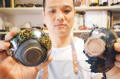 家住江西省南昌市新建區(qū)的鋦瓷技藝非遺傳承人熊昊陽展示破損的瓷器經(jīng)過修復(fù)后重放光彩。時 雨攝(人民視覺)