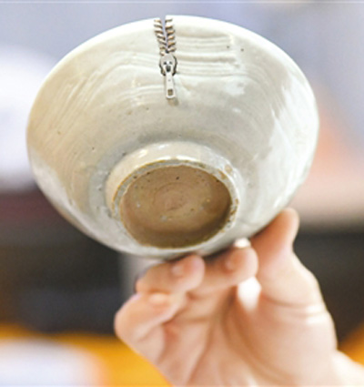 鋦瓷是一項古老的民間手藝,是把打碎的瓷器,用像訂書釘一樣的金屬“鋦子”,再修復(fù)起來的技術(shù)。通過運用殘瓷上的沖線或殘缺,巧妙地將鋦釘嵌入其中,讓破損瓷器恢復(fù)使用功能,也提升了瓷器本身的藝術(shù)性。在宋朝名畫《清明上河圖》里,就可以看到街邊“鋦瓷”的場景。
