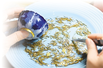 李軍航為殘破瓷器選配鋦釘。 陳其保攝(新華社發(fā))
