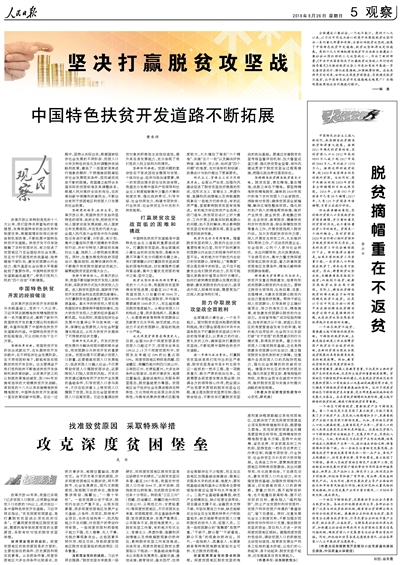 全面建成小康社會,一個也不能少。黨的十八大以來,以習(xí)近平同志為核心的黨中央圍繞脫貧攻堅作出一系列重大部署和安排,全面打響脫貧攻堅戰(zhàn),拓展了中國特色扶貧開發(fā)道路,脫貧攻堅取得決定性進展。黨的十九大明確把精準脫貧作為決勝全面建成小康社會必須打好的三大攻堅戰(zhàn)之一,作出了新的部署?!吨泄仓醒雵鴦?wù)院關(guān)于打贏脫貧攻堅戰(zhàn)三年行動的指導(dǎo)意見》為推動脫貧攻堅工作更加有效開展進一步完善頂層設(shè)計、強化政策措施、加強統(tǒng)籌協(xié)調(diào)。在未來兩年多時間里,如何攻克深度貧困堡壘,實現(xiàn)穩(wěn)定脫貧不返貧,讓中國特色扶貧開發(fā)道路越走越寬廣?本期觀察版圍繞這些問題進行探討。