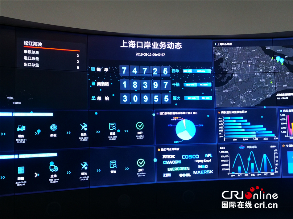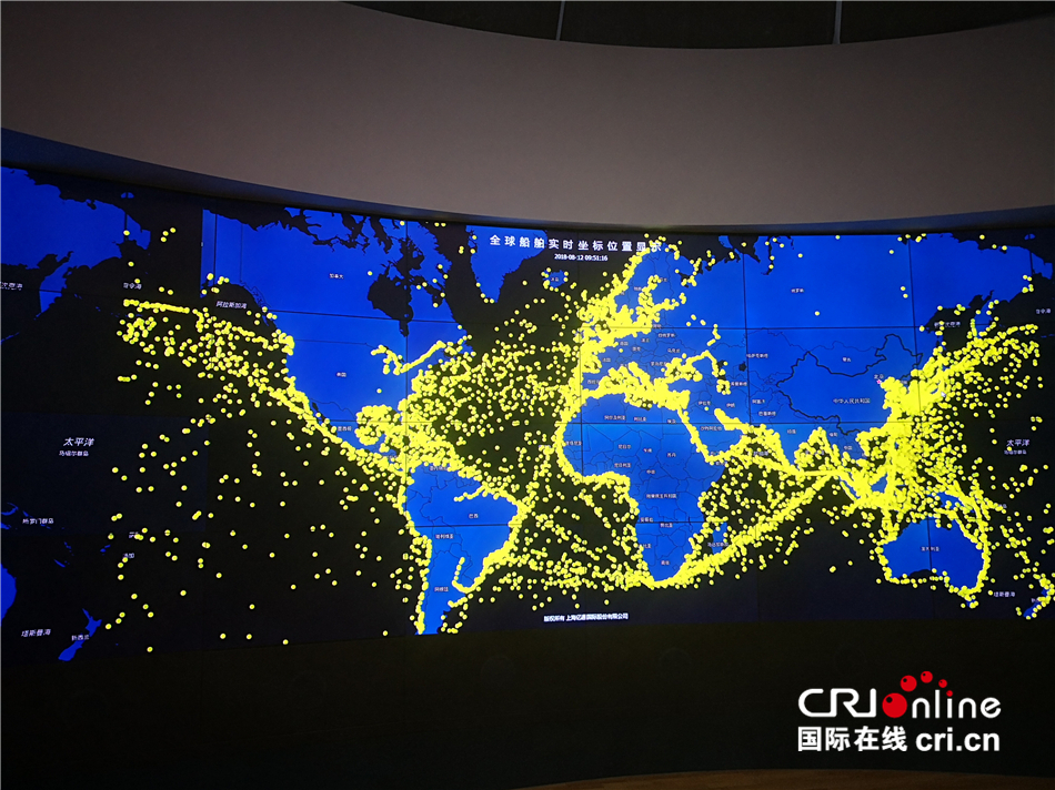 在上海國(guó)際貿(mào)易單一窗口運(yùn)營(yíng)方、上海億通公司的電子大屏上,密密麻麻的黃色光點(diǎn)顯示著全球船舶的實(shí)時(shí)坐標(biāo)位置、上??诎稑I(yè)務(wù)動(dòng)態(tài)等關(guān)鍵信息。