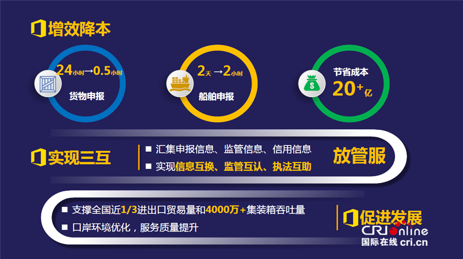 不僅如此,通關(guān)一體化改革后,出口貨物檢驗(yàn)檢疫通關(guān)放行時(shí)間從原先的兩天半縮短至1天,每批貨物成本從200元人民幣降低為100元;進(jìn)口貨物檢驗(yàn)檢疫通關(guān)放行時(shí)間從一天半縮短為半天,每批貨物至少節(jié)約成本300元人民幣。
