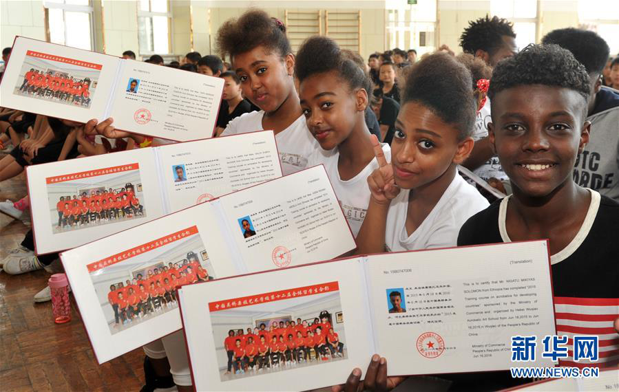 2016年6月12日,河北吳橋雜技藝術(shù)學(xué)校的埃塞俄比亞留學(xué)生展示結(jié)業(yè)證書。? 新華社發(fā)(苑立偉 攝)