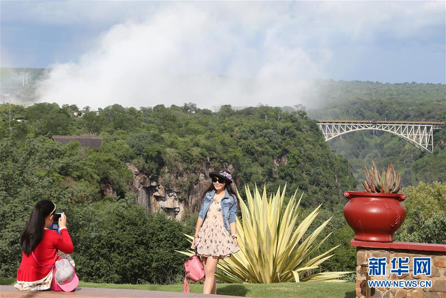 2017年1月27日,在津巴布韋維多利亞瀑布城,來(lái)自中國(guó)的一對(duì)母女以遠(yuǎn)處的贊比西鐵橋?yàn)楸尘芭恼樟裟?。近年?lái),春節(jié)假期期間前往非洲旅游的中國(guó)游客逐漸增多。? 新華社發(fā)(費(fèi)列蒙攝)