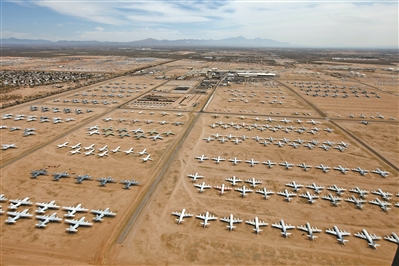美國亞利桑那州的一片沙漠中,坐落著“航空航天維護與再生中心”。這里封存著美國大部分退役飛機,被稱為“飛機墳場”。這些總價值達350億美元的退役報廢飛機,幾乎涵蓋了二戰(zhàn)以后美軍所有軍用飛機機型。駐扎在那里的美軍,每天都會對封存的飛機進行維護,時刻準備讓其中一些重返藍天。